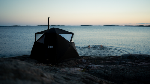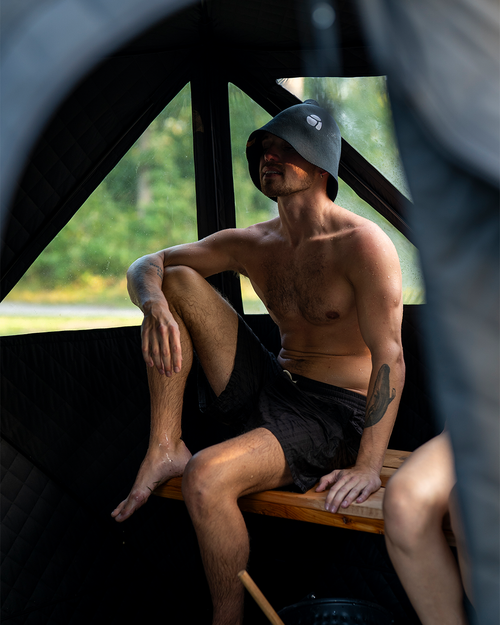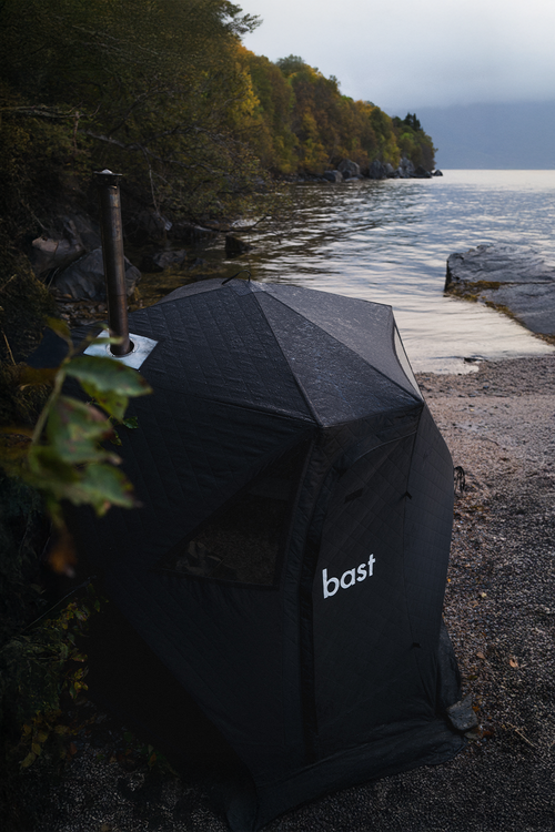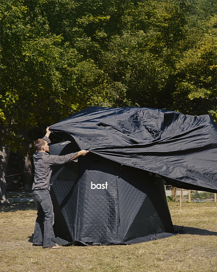 Das Pop-Up Zelt kann in weniger als zwei Minuten aufgebaut werden. Sobald das Zelt steht, wird es mit Heringen und Sturmleinen gesichert. Dann bringst du den Ofen hinein und montierst die Schornsteinteile. Wenn der Ofen stabil steht, kannst du das Feuer entzünden. Insgesamt solltest du etwa 15 Minuten einplanen, um die Sauna vollständig aufzubauen und zu starten.