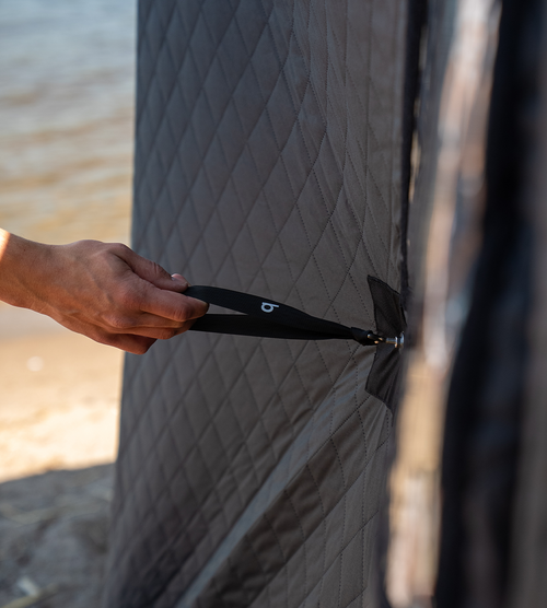 Wir zeigen dir, wie du den Wetterschutz an deinem Saunazelt montierst und sicherst.
