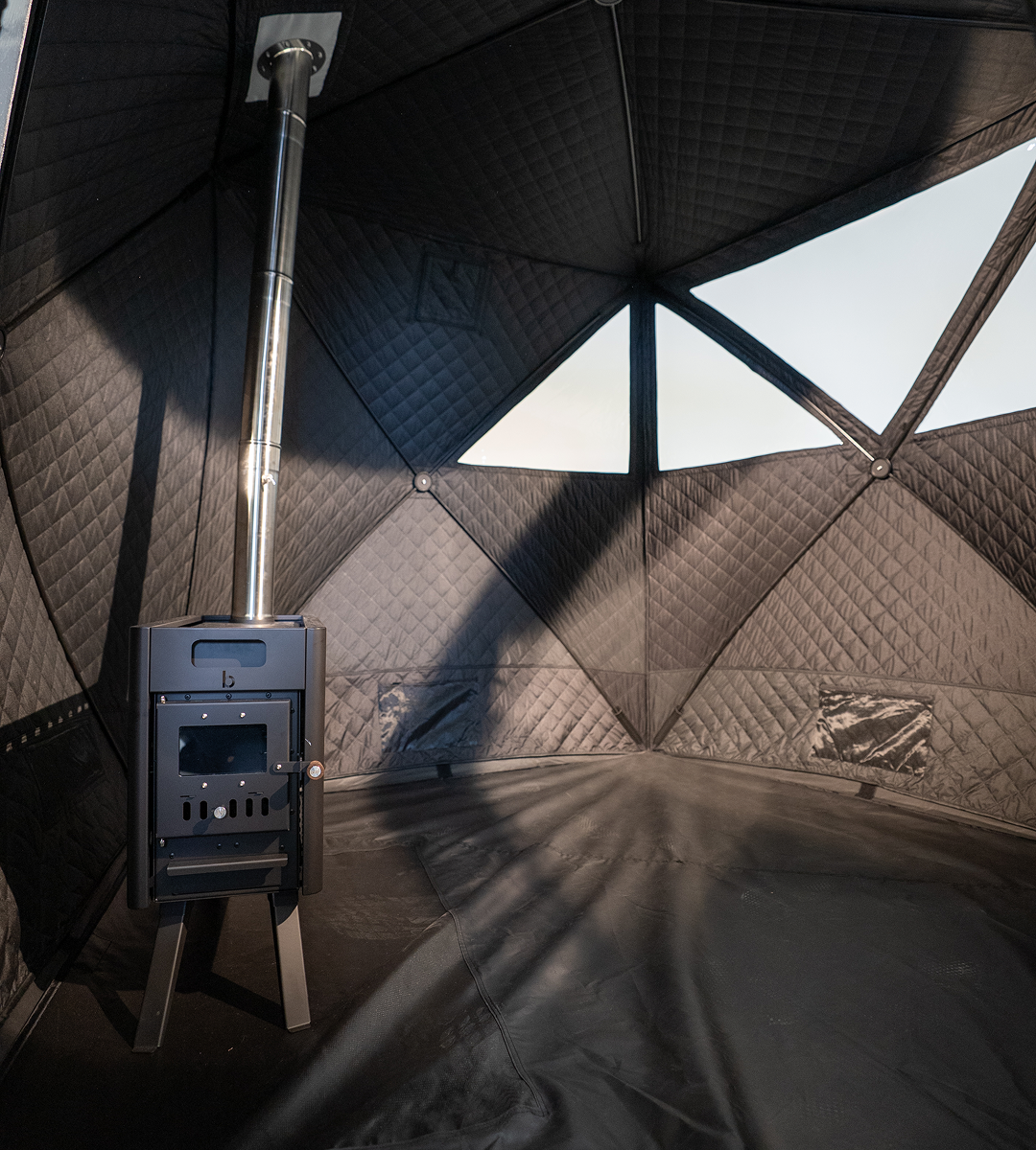 The tent can be set up in under two minutes by pulling out its five sides in one motion. Once it’s up, secure it with stakes and storm lines. Bring in the stove and assemble the chimney parts. When the stove is stable, you can start the fire. In total, expect about 15 minutes to set up and get the sauna running.